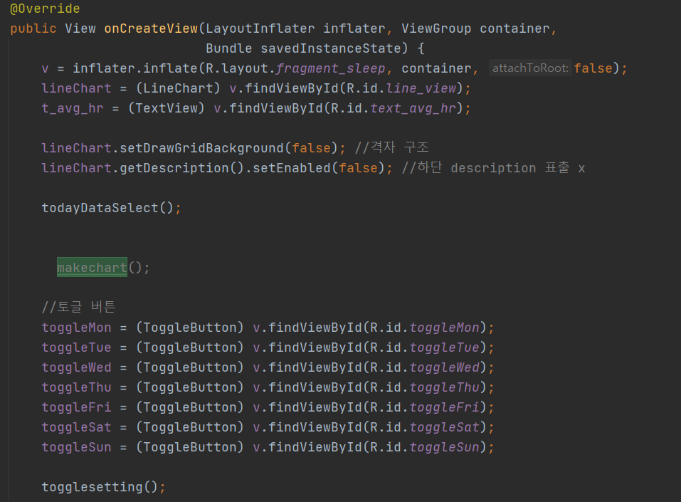 저는 activity가 아닌 fragment에서 사용했으므로 onCreateView에 toggle button과 관련된 코드를 작성했습니다