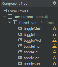 toggle button을 넣을 layout에 LinearLayout(horizontal)을 넣고 하위단에 버튼을 넣어줍니다 - 이유 : 가로 정렬